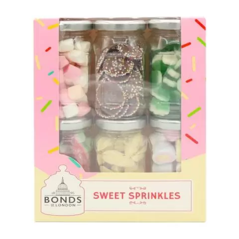 The Bonds Sweet Selection is a great gift for any sweet lover! Each 285g gift box contains 6 jars filled with our most popular sweets – Pink & white mini mallows, milk chocolate jazzies, mini jelly frogs, fizzy watermelons, white mice and mini mallows.