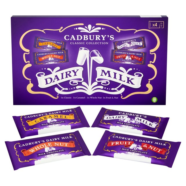 A retro Christmas selection box which contains a classic collection of Dairy Milk, Dairy Milk Whole Nut, Dairy Milk Caramel and Dairy Milk Fruit & Nut in Cadbury heritage wraps. An original Cadbury Christmas gift to wish ‘Merry Christmas’.