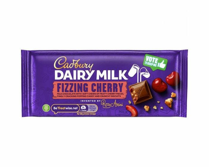 Cadbury Dairy Milk Fizzing Cherry is a tasty milk chocolate bar with soft chews of fruity cherry pieces, tingly cracking popping candy and crunchy biscuits. This generous 110g bar is perfect for sharing.