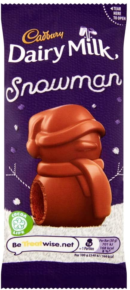A festive Christmas stocking filler, Cadbury Dairy Milk chocolate mousse snowman. A milk chocolate Christmas shaped snowman with a chocolate mousse centre.