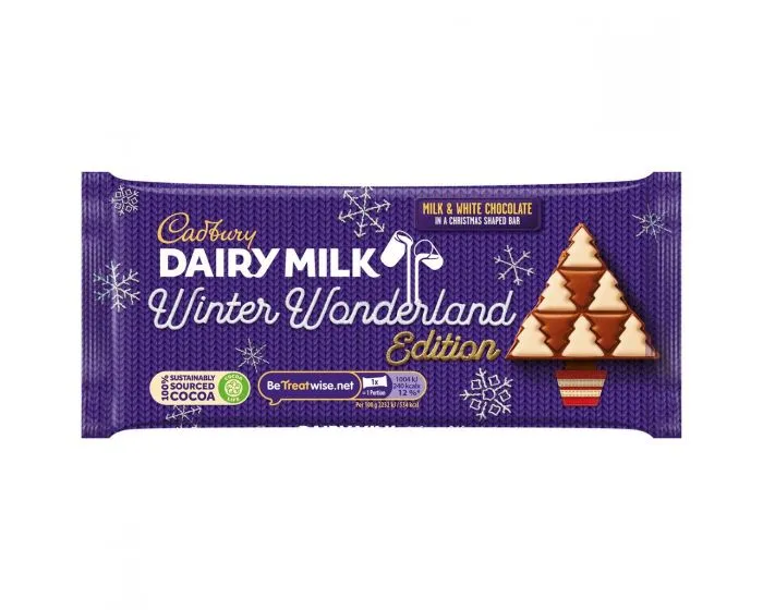 Why have just one type of creamy Cadbury chocolate in a bar, when you can have two? This limited edition bar of Cadbury Dairy Milk is made up to white and milk chocolate Christmas trees, a wonderfully different way of enjoying the famous taste of Cadbury. This Winter Edition of Dairy Milk is a popular treat during the festive period.