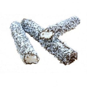 Marshmallow logs, with a chocolate flavour coating dusted in coconut sprinkles.