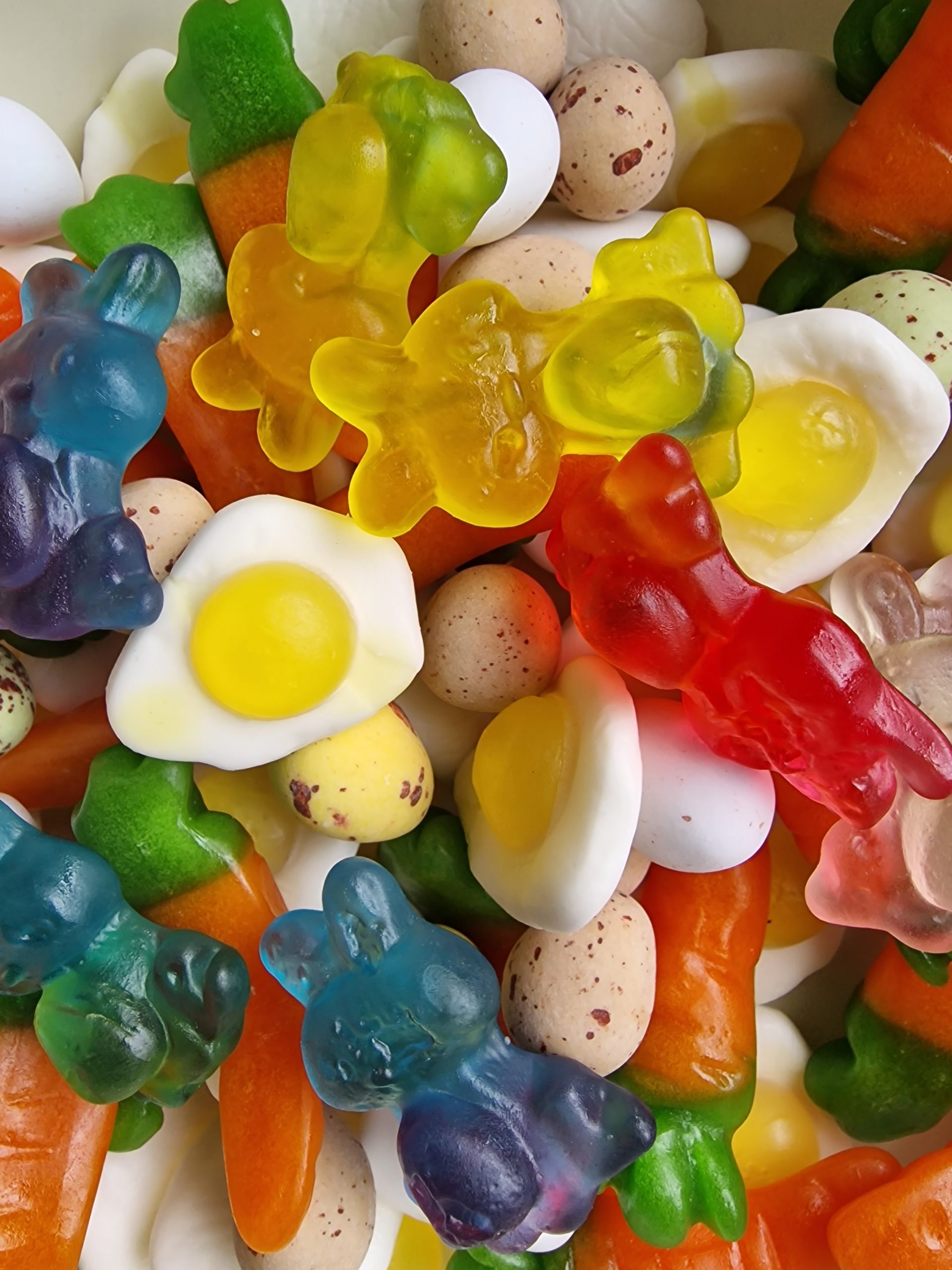 consisting of haribo eggs, choc mini eggs, gumny carrots & jelly bunnies this mix is the perfect Easter treat