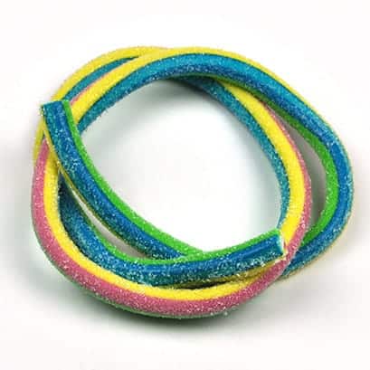 Fizzy multi coloured jumbo cable with a white fondant centre.