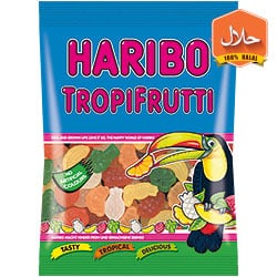 Haribo tropifrutti – 80g. Hard on the outside, soft on the inside – the unmistakable texture makes HARIBO Tropifrutti one of a kind and has won over lots of fans, now in a halal friendly version