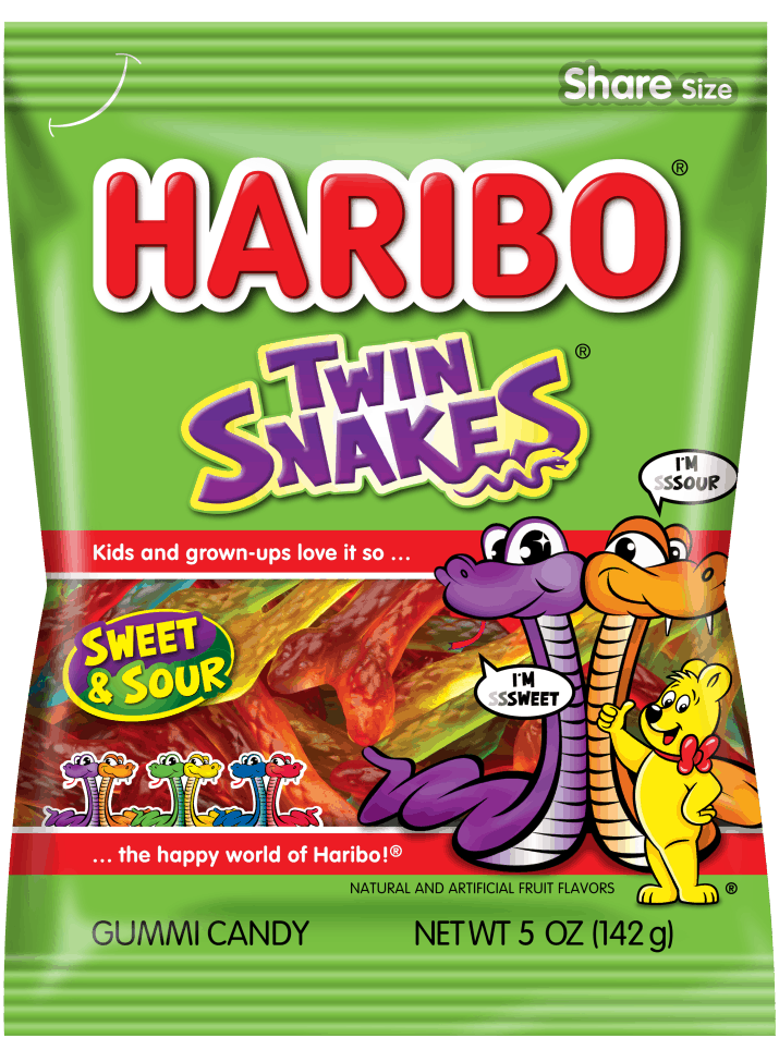 Sweet and Sour, Haribo Twin Snakes is a mix of gummy jelly snake shaped pieces attached in pairs with one snake sweet and one sour.