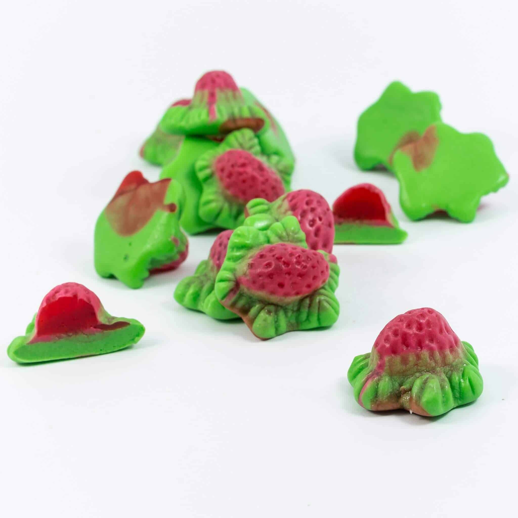 Strawberry flavoured jelly filled sweets in the shape of a strawberry.