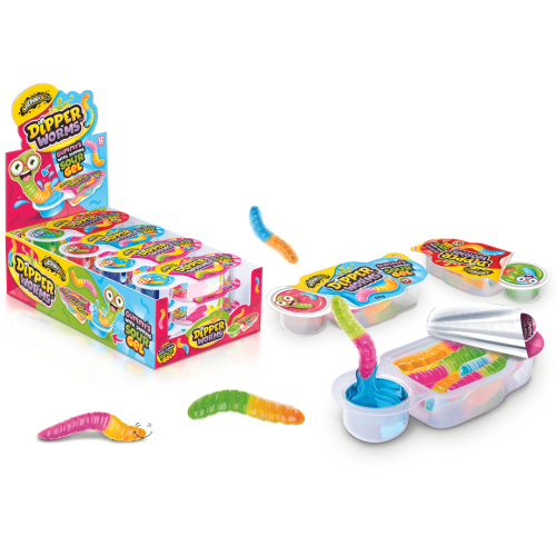 Mixed fruit flavoured gummy sweets in the shapes of worms, with a sour gel dip