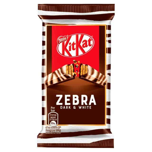 Four crispy water fingers covered in dark chocolate (38.5%) and white chocolate (27.5%)