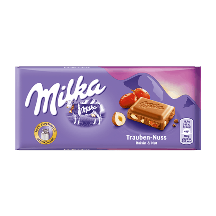 Milka Raisin & Nut Bar is deliciously smooth milk chocolate, made from Alpine milk, with crunchy hazelnut pieces and juicy raisins. This generously sized bar is perfect for sharing.