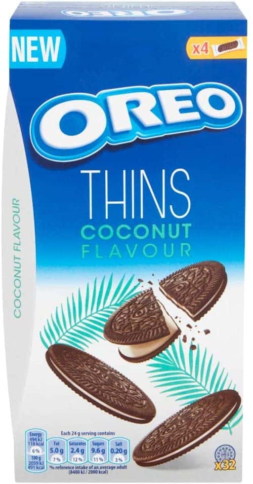Chocolate flavour sandwich biscuits with a coconut flavour filling