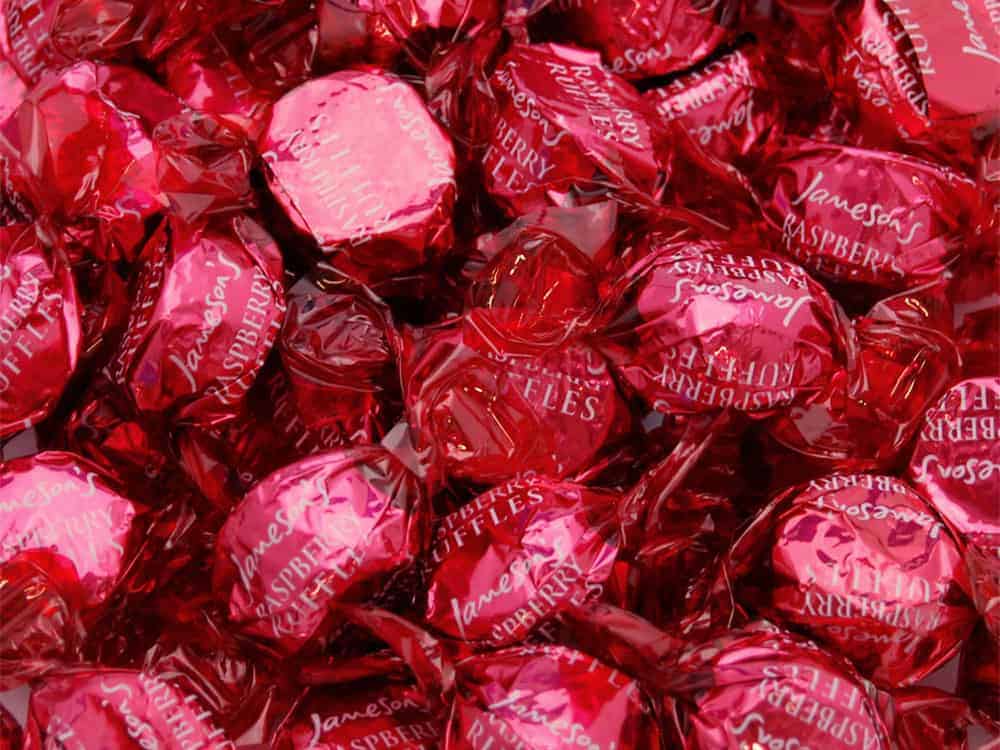 Wrapped raspberry flavour coconut fondant creams covered in dark chocolate.