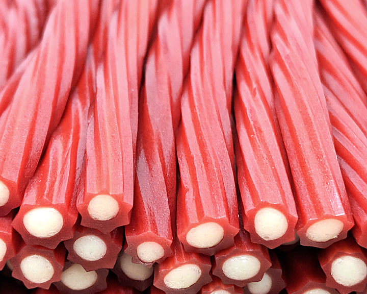 Strawberry Twisters are a popular choice thanks to their familiar flavour and soft bite. Long lengths of strawberry flavoured soft candy with a white fondant centre.