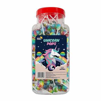 Multi-coloured, unicorn themed fruit lollipops.