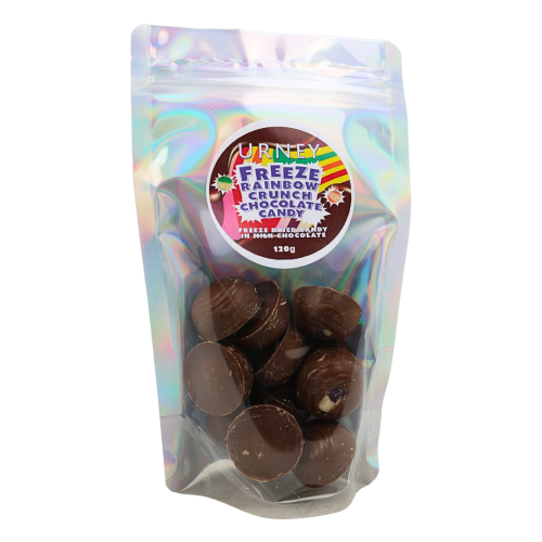 Freeze dried candy encased in a smooth milk chocolate, in the shape of a button. Stored in a handy resealable pouch